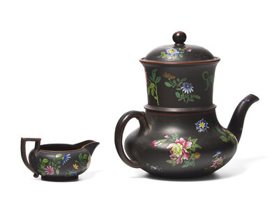A Wedgwood Capriware Black Basalt Teapot with Strainer and Creamer