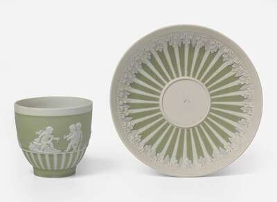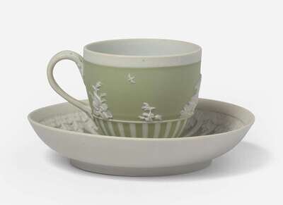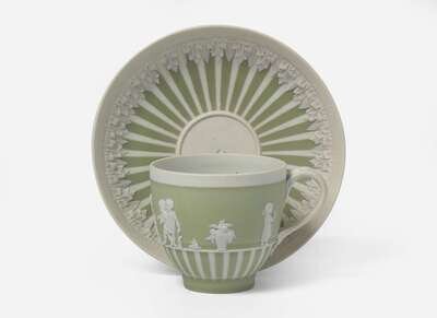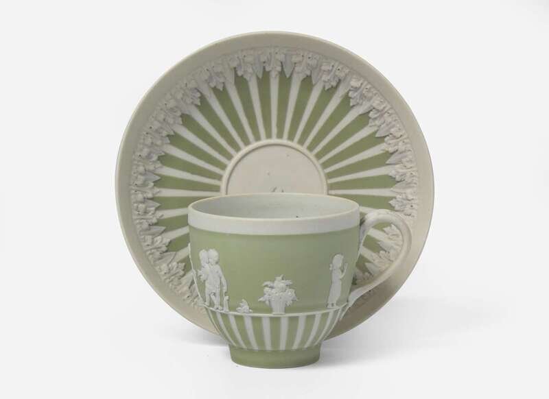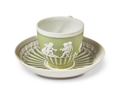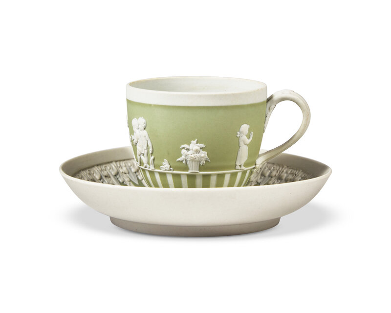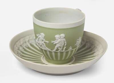Modeled with putti and acanthus leaf-tips; the cup and saucer both engine turned; each with impressed Wedgwood stamp.