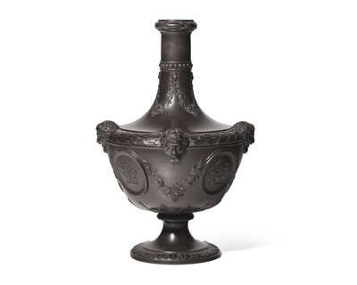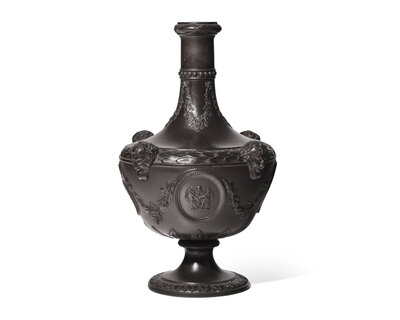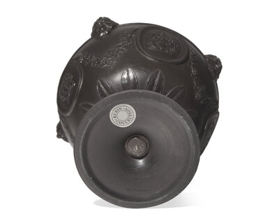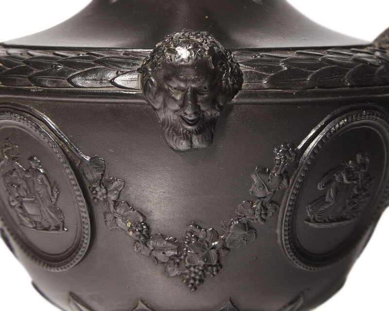 Modeled in relief with garland swags and satyr busts to shoulder; impressed Wedgwood stamp.