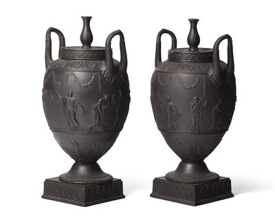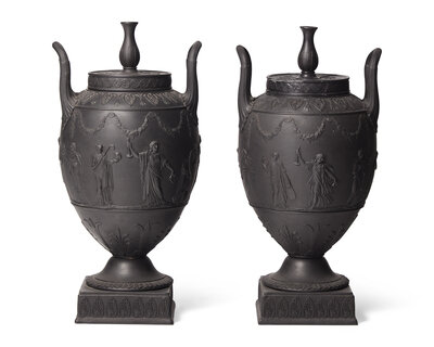 A Pair of Wedgwood Etruria Black Basalt Covered Urns