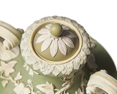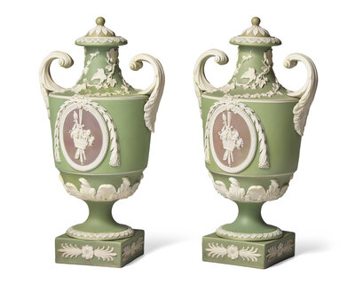 A Pair of Wedgwood Sage and Lilac Jasperware Twin Handled Urns