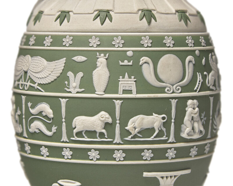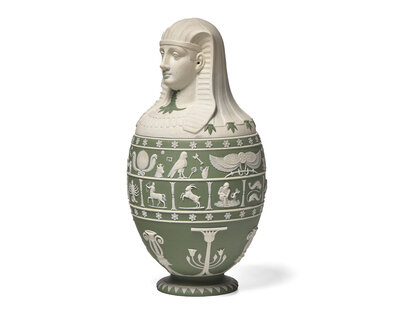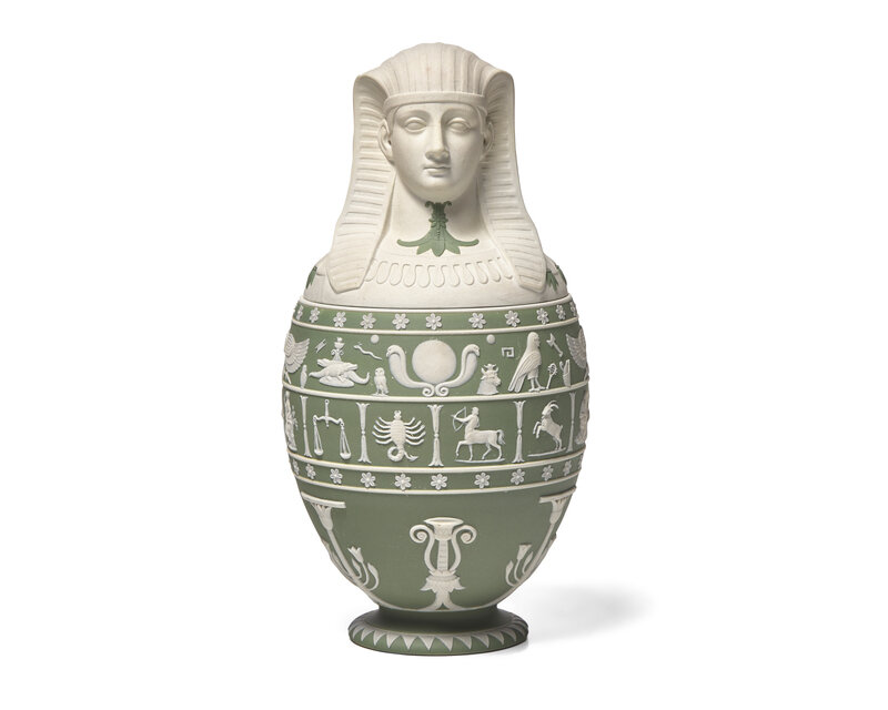 The biscuit bust atop sage gree body with hieroglyphs and zodiac; impressed Wedgwood mark, date cypher V and maker's mark WOE.