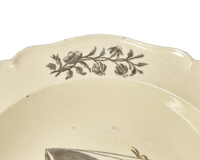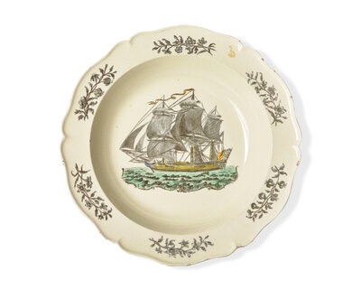 The rim with floral sprays and center with three-masted ship; unmarked.