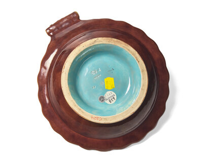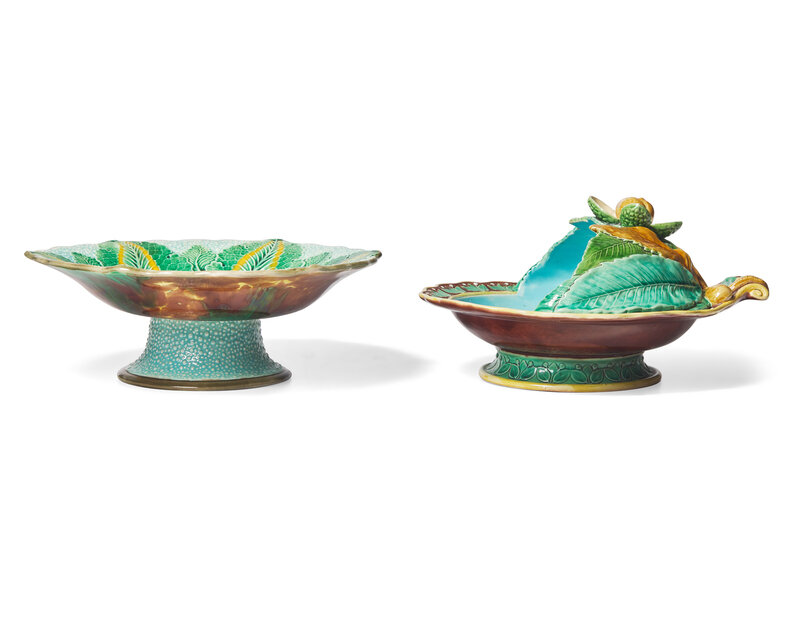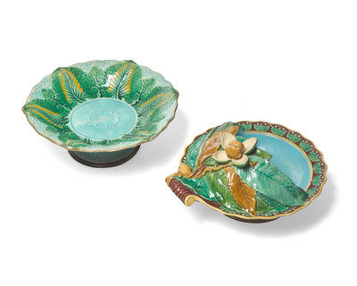 The server modeled with chestnuts and leaves to a scallop-edged shell-shaped bowl with robin's egg blue interior, impressed marks; together with a cauliflower tazza; unmarked.