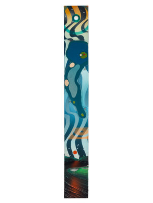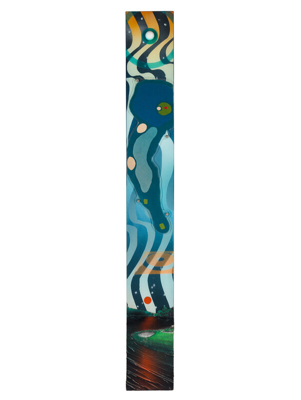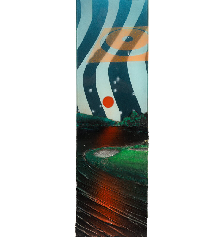 spray paint, gouache, golf ball, felt, sandpaper and Plexiglas on glass and masonite