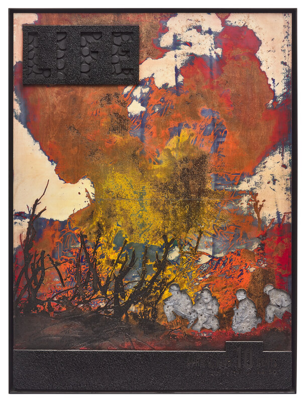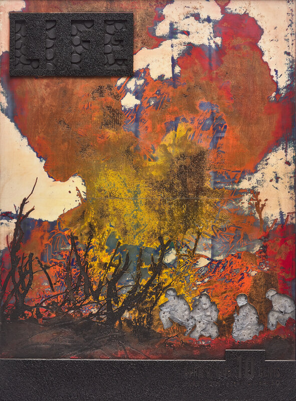 polymer paint, wood, epoxy resin, pigment, lead on panel, powdercoated stainless steel frame