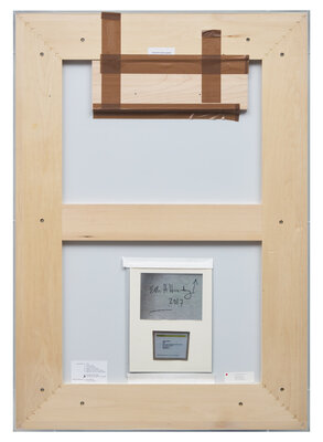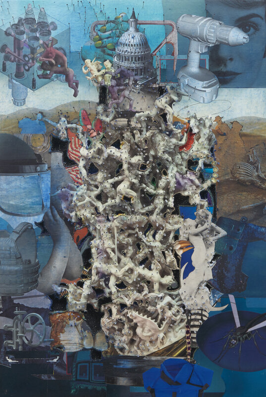 paper, oil, pins, shell, fabric, foam and linen over panel