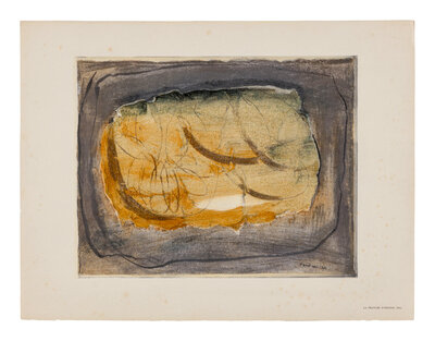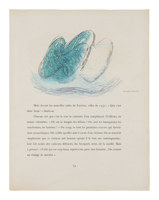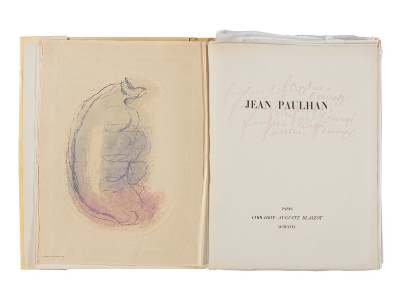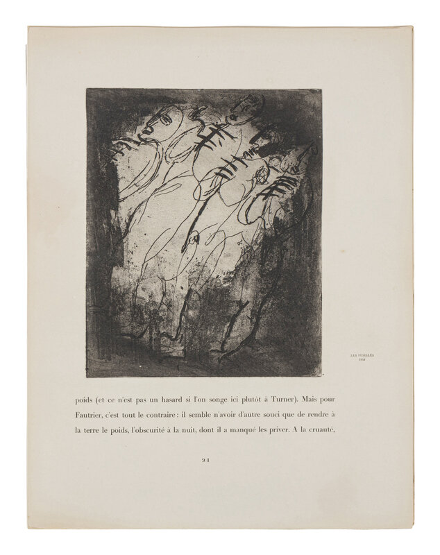 First edition, limited to 204 copies, of which this is number 170, from a total edition of 250 examples, with reproductions of Fautrier's work in-texte and horstexte. Reproductions printed by Mourlot. 64 pages. Frontispiece etching on Tonkin with soft crease. Folio. Sheets and plates loose in paper portfolio and board chemise, inside cloth-covered board slipcase. Slipcase with lot number 1101O tag from the Jacqueline Kennedy Onassis Addendum sale April 23-26, 1996. With twenty-four illustrations in the text, comprising seventeen multi-color etchings, two etchings in black, one by xylography, two heliogravures and two by zingography; and four of five varnished lithographic plates. The varnished lithographs are large plates, at approximately 19 1/2 x 15 inches.
