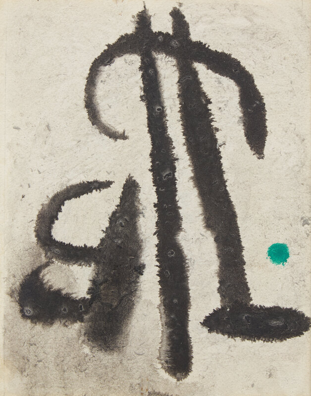 gouache, black India ink and brush on two overlapping sheets of burnt paper
