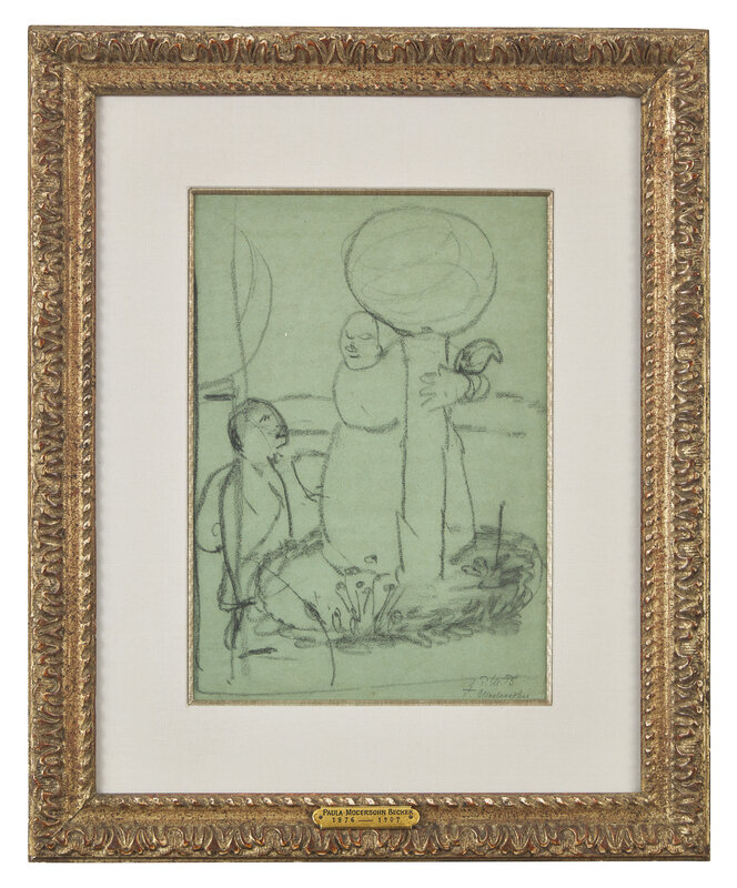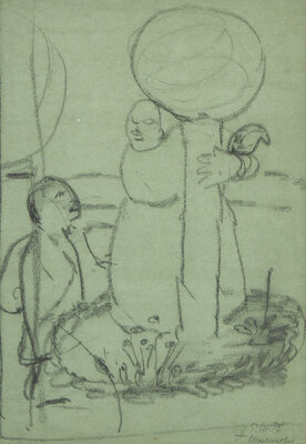 Stehende Armenhaüslerin und Kind zwischen zwei Glaskugeln auf Stangen (Standing Poor Woman and Child between Two Glass Balls on Poles), 1907