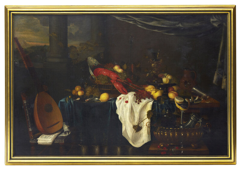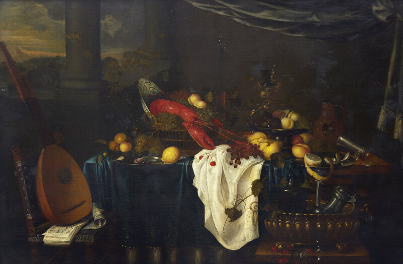 Tabletop Still Life with Lobster, Lemons, Grapes, a Lute, and Tankards, 1648