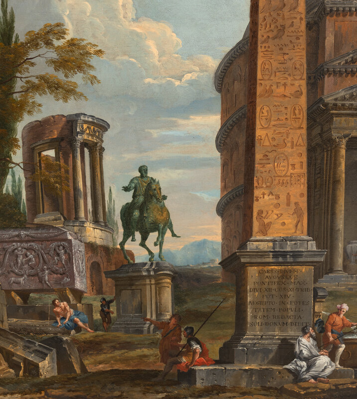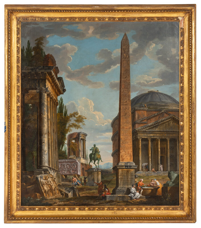 A Capriccio With Figures Gathered Around the Obelisk of Augustus, a View of the Pantheon, the Statue of Marcus Aurelius and the Temple of Sybil, Tivoli