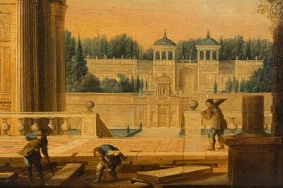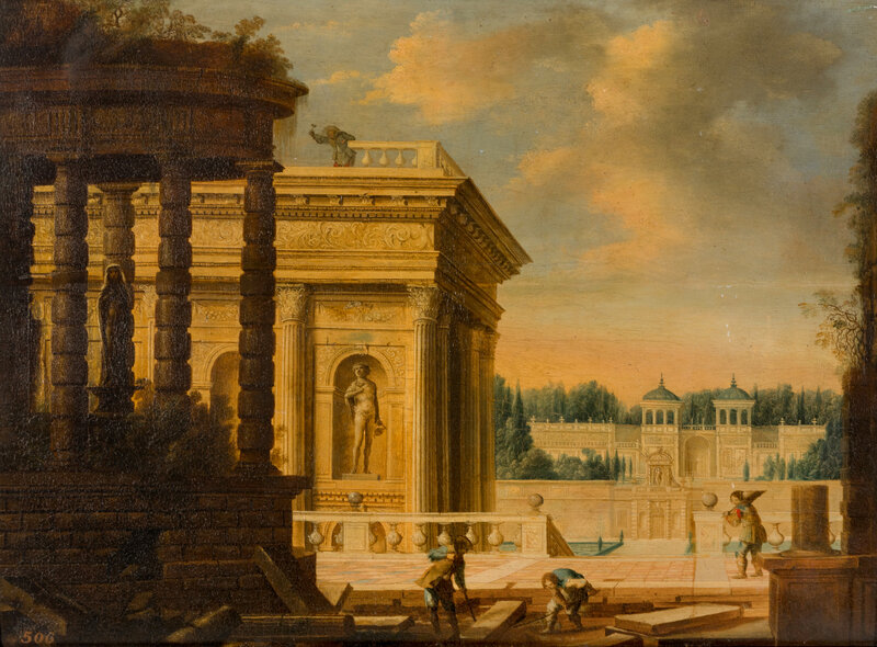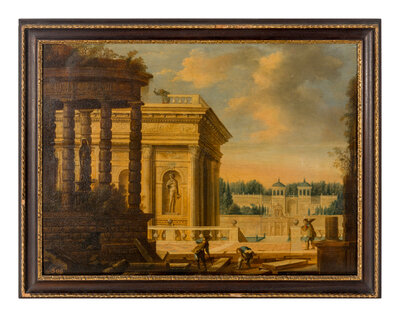 A Capriccio View of a Classical Palace, the Grounds being Finished by Men Setting Paving