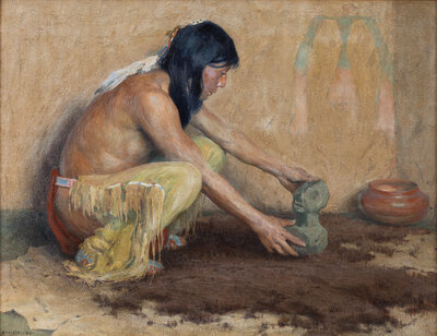 signed E. I. COUSE (lower left); inscribed "The Prehistoric Image" / Painted 1915 by E. Irving Couse, N.A. (stretcher)