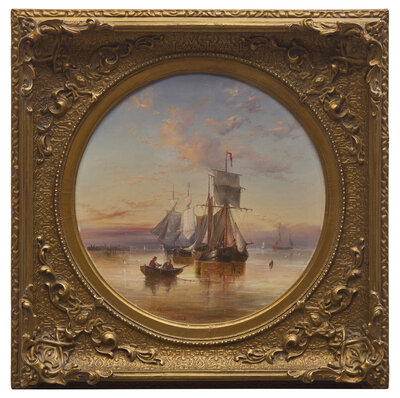 Barges and other shipping drying their sales in an estuary anchorage, 1860