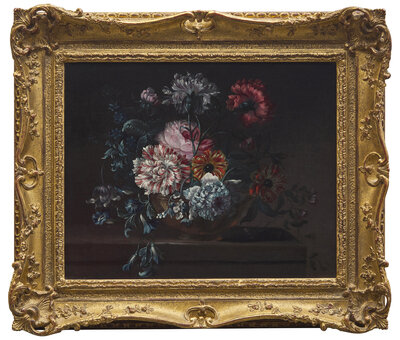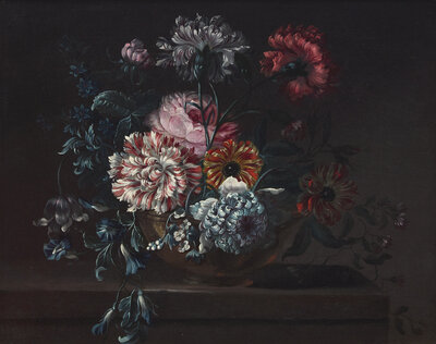 Still Life of Variegated Carnations and Other Flowers on a Ledge