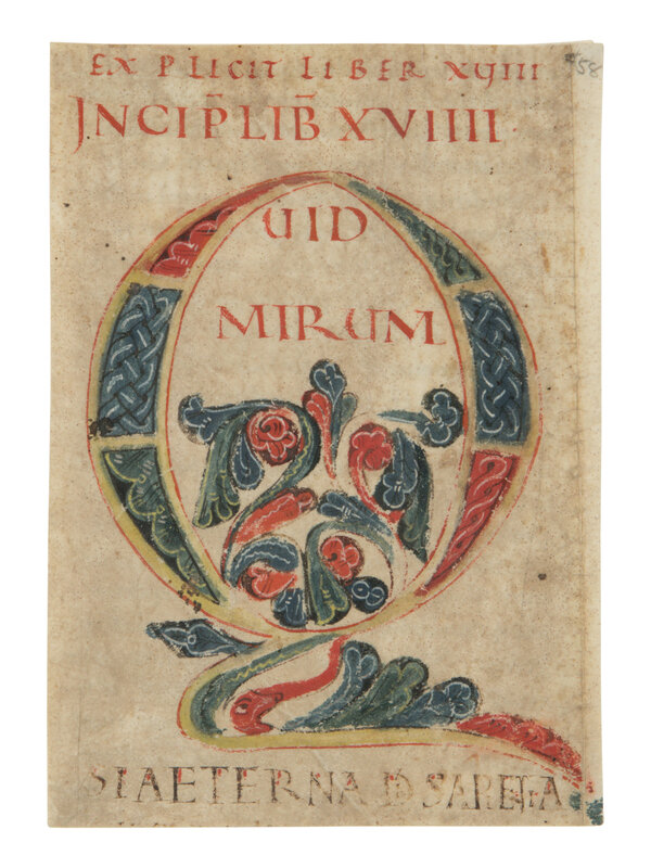 174 × 126 mm. Single cutting written in a fine Caroline minuscule, with the rubric and incipit rendered in a formal rustic capital script in red ink, decorated initial ‘Q’ in center of cutting integrating the first words of the text (QUID MIRUM) within body, initial executed in vivid palette of red, yellow, and dark blue-green, infilled with stylized foliate and interlace motifs. The parchment is generally well-preserved, with some surface abrasion and minor smudging, particularly at the lower and right margins, with some loss to text, cropping at the top and bottom edges has slightly truncated parts of the rubric and final line, else in good condition.