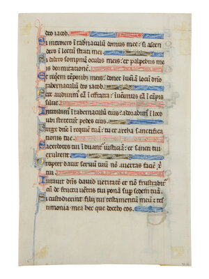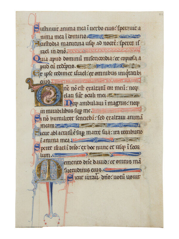 235 × 170 mm. Single leaf ruled in brown ink and written below the top line for single column of twenty-one lines, inscribed in pencil with modern stock number “8826” on verso, line-fillers alternating between gold and red or blue penwork, and occasionally in form of fish, verses marked by one-line initials alternating in gold with blue penwork or blue with red penwork, one three-line initial ‘M’ begins Psalms 131, executed in gold with predominantly blue penwork, ONE INHABITED INITIAL ‘O’ of three lines with dense blue and red penwork highlighted with white filigree on gold ground inhabited by a dragon. Some flaking to gold leaf revealing the underlying pink bole, else in good condition.