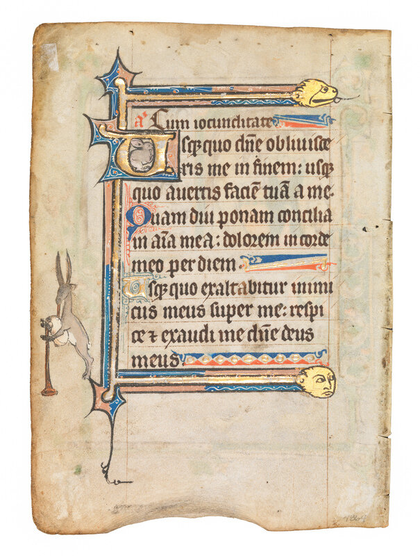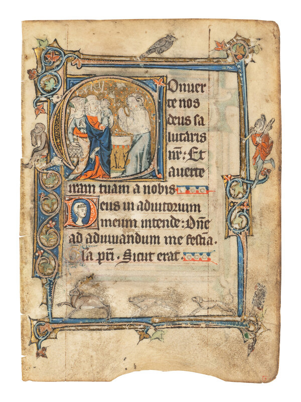 c. 120 × 90 mm, single leaf ruled in ink for single column of eleven lines, (justification: 61 × 47 mm) written in two sizes of Gothic book hand, single-line verse initials alternate between gold with blue penwork and blue with red penwork, two-line initials often historiated or inhabited with motifs such as a rabbit, a human head, and similar subjects and typically integrated into a three-sided border (open on the right) terminating in gold animal- or dragon-head terminals, major text divisions marked by ONE HISTORIATED INITIAL of six-lines on burnished gold grounds, accompanied by full four-sided borders populated with naturalistic birds, a monkey, human figures, and other marginalia, bas-de-page often containing narrative scenes, such as a stag chased by hounds, while the outer margins frequently include standing figures or animals approximately five lines tall, shown engaged in a variety of whimsical or symbolic activities. Significant wear to parchment with losses to pigments and gold in some places, else in fair condition.