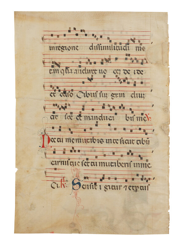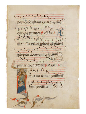 551 × 380 mm. Single leaf with vertical bounding lines faintly ruled in plummet or leadpoint for a single column with seven groups of four-line staves, each 32 mm, text written in black ink in textualis rotunda and music in black ink with square notation (notae quadratae), versals and responsories in red, one smaller pen-flourished initial ‘A’ in blue with red and purple ink penwork appears in the upper right quadrant of the page, ONE HISTORIATED INITIAL ‘I’ of approximately six lines depicting a bishop saint—likely St. Augustine—shown in episcopal vestments with mitre and crosier, set against a gold ground and framed within a tabernacle-like architectural initial, vine-like tendrils extend from the historiated initial into the lower and left margins, terminating in a bird-like hybrid creature and floral foliate terminals in red and grey. Minor creases, staining, and loss at corners, margins slightly trimmed, but the overall legibility and integrity of the musical content and decoration remain intact.
