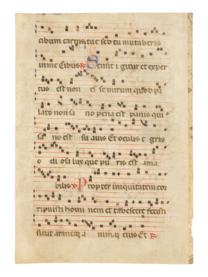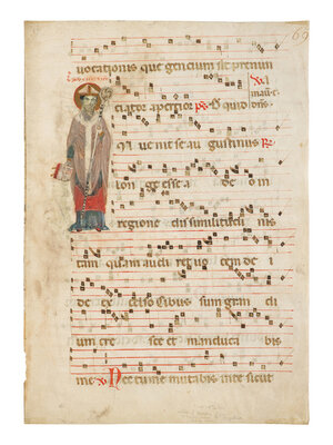 503 × 352 mm. Single leaf from a large Antiphonary, ruled in red ink for musical staves and with drypoint or faint plummet lines for vertical bounding lines (justification: 422 × 275 mm), foliated "69" in the upper right margin. Text in Gothic script with versals, psalm incipits, and responsories marked by red initials, additional one-line red initials indicate new sequences, musical notation comprises square neumes on a four-line red staff, with distinctive stylized custodes at line ends, each terminating in an elegant, sweeping diagonal flourish, ONE HISTORIATED INITIAL ‘I’ depicting Saint Augustine, labeled Augustus episcopus, standing in episcopal attire and forming the vertical shaft of the letter. Notable wear to the painted surface—especially the face and halo—suggests devotional handling, likely prompting later overpainting. Slight cockling and minor discoloration to the vellum, otherwise in good condition.