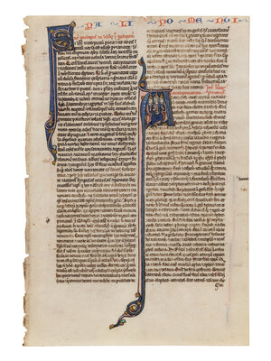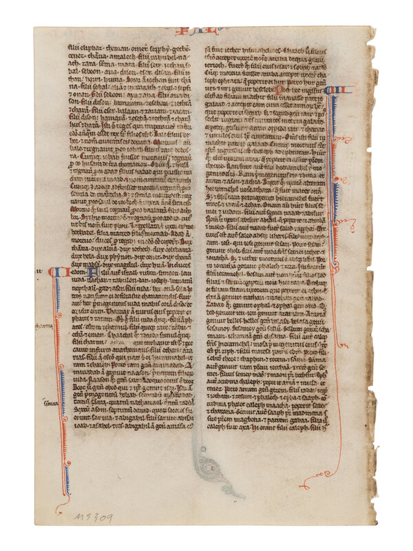 197 × 130 mm. Single leaf ruled in plummet for two columns of fifty-two lines (justification: 138 × 89 mm), written in gothic textualis, rubrics in red, with headings and chapter numbers in red and blue, verses indicated by tiny red strokes through letterforms, chapter initials in red or blue with fine pen flourishing in the opposite color, running headers in alternating red and blue, marginal notations and glosses added by contemporary hand on both recto and verso, one illuminated puzzle initial in left column introduces the Prologue, executed in blue and red, with contrasting filigree flourishes extending vertically into the margin, ONE HISTORIATED INITIAL of similar design on burnished gold ground with three Kings of Israel introducing 1 Chronicles (Paralipomenon), both initials with bifurcated letter stems filled with refined foliate motifs in white and ochre, framed by a delicate band of alternating pink and blue. The vertical and horizontal extensions terminating in trilobed finials. Trimming present with partial loss to header on verso, light wear to vellum, small abrasions to gutter, else in good condition with pigments and gold radiant.Accompanied by the original booklet and descriptive essay authored by Bruce Ferrini, providing historical context and commentary on thirteenth-century Bibles.