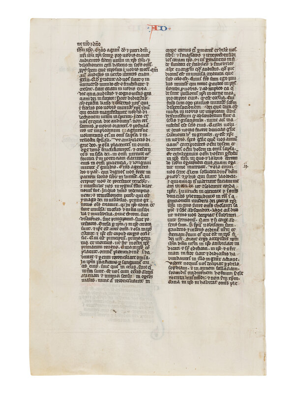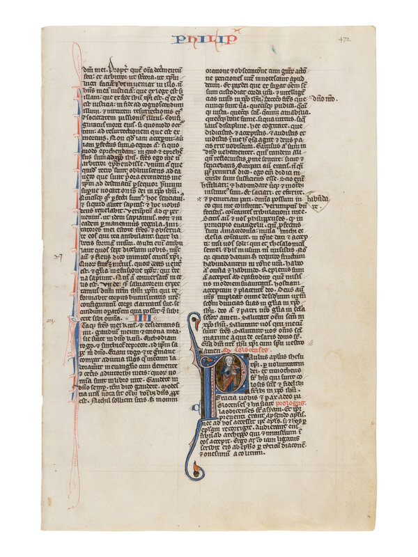 288 × 193 mm. Single leaf, ruled in plummet for two columns of fifty lines (justification: 195 × 129 mm) later foliation “472” in top right margin, written in a small gothic liturgical hand in black ink, with glosses and cross references in the margins, rubrics in red, 4-line chapter initial in red on verso, pen-flourished bar border in alternating red and blue with extensions to upper and lower margins on verso, ONE HISTORIATED INITIAL of ten lines painted on recto in blue and pink on burnished gold ground, with white tracery and lengthy scrolled extensions to lower margins, tape stains on the four corners of the verso, slight cockling of the parchment, else in good condition