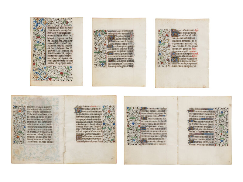 Two bifolios and three leaves from a Book of Hours, with miniatures of Saint Mark and the Virgin and Christ Child Enthroned, in Latin and French, illuminated manuscript on parchment [France, Paris, c. 1450–1470]