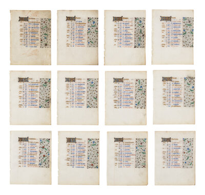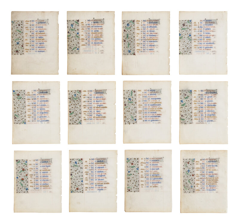 Calendars in fifteenth-century Books of Hours served both devotional and practical functions, allowing readers to track the liturgical year and mark personal commemorations alongside Church feast days. The use of gold to denote major feasts, particularly local Parisian saints, reflects a commission of notable luxury and expense, emphasizing the manuscript’s prestige and the elevated status of its original owner. Executed in Paris circa 1450–1470, these twelve calendar leaves were illuminated by a workshop in close proximity to the circle of the Master of Jean Rolin II (see lots 41 and 42 for leaves from the same manuscript).