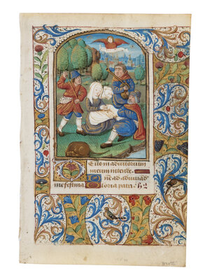 This leaf exemplifies the lively pictorial style associated with the so-called Playfair Group, a circle of artists active in Rouen in the third quarter of the fifteenth century and closely related to the Master of the Rouen Échevinage. Characterized by luminous color, finely modeled figures, and delicate gold highlighting, their work reflects both native Norman traditions and Parisian influence, especially that of the Boucicaut and Bedford circles. The Master of the Rouen Échevinage (also known as the Master of the Geneva Latini), takes his name from the splendid manuscripts, mostly chronicles, he painted for the Bibliothèque des Echevins in Rouen, the public library assembled by the aldermen of the city. Largely responsible for Books of Hours, the related Playfair Group of illuminators was dubbed by Watson (1984) after the artist responsible for a Book of Hours in London (Victoria and Albert Museum, MS L. 475-1918). These illuminators dominated production in Rouen after the departure of the English in 1449 through the 1480s.