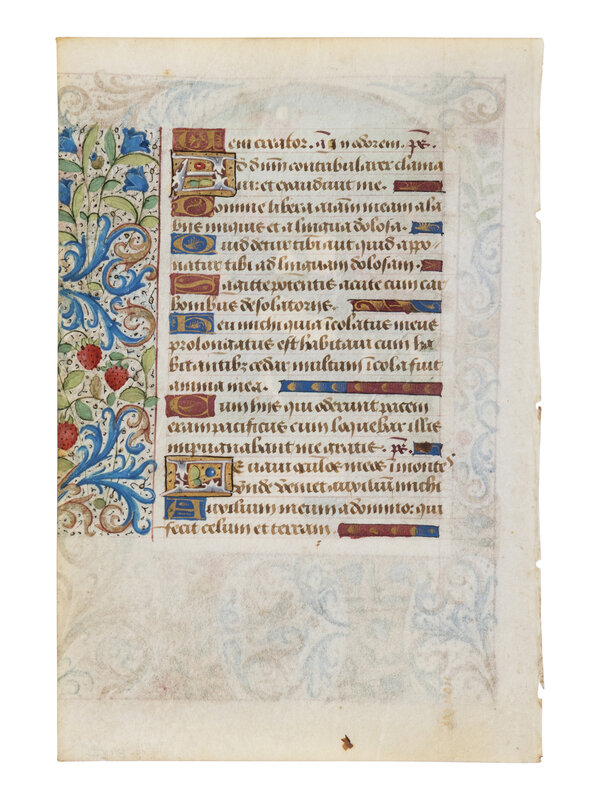 166 × 113 mm. Single leaf, ruled in red ink for a single column of twenty lines (justification: 95 × 68 mm), written in a fine bâtarde script in dark brown ink, rubrics in red, two two-line initials in in gold on blue and red ground, one large three-line foliate initial in red and white ink on gold with floral infill, full panel borders on the recto composed of stylized blue and gold acanthus, trompe-l’oeil fruit and flowers, birds, and curling ivy, A FULL-PAGE MINIATURE of the Annunciation to the Shepherds, framed in a faux-arched gold frame, the scene shows a group of shepherds with a maiden and a small dog in the pasture, a craggy hillside with a city in the distance, verso with additional border of red and green floral sprays, acanthus, strawberries, and illuminated initials on gold grounds. Some rubbing to the outer edge and occasional flaking in the border paint; minor cockling; else in excellent condition, with colors and gold exceptionally vibrant.