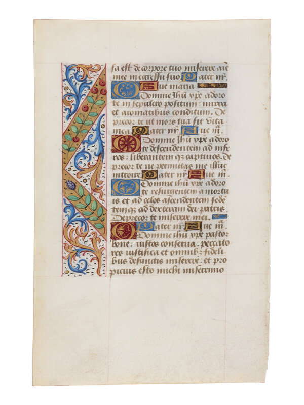 203 × 138 mm. Single leaf, ruled in brown ink for a single column of twenty lines (justification: 124 × 70 mm), written in a Lettre bâtarde script in dark brown ink, rubrics in red, one- and two-line initials in liquid gold on blue, red, and brown grounds, line-fillers in blue and red with liquid gold highlights. ONE QUARTER-PAGE MINIATURE depicts the Mass of Saint Gregory, full diagonal banded border on both recto and verso filled with colorful acanthus, scrolling foliate bands, tulips, and roses on gold ground, all outlined in red and black. Margins clean and ample; gold and pigments exceptionally fresh and sparkling; minor thumbing to lower border, verso equally well preserved.