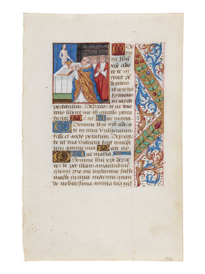 This leaf originates from a dispersed Book of Hours attributed to the Master of the Entry of Francis I, an anonymous illuminator active in Lyon between about 1485 and 1515. The illuminator is named after a manuscript now in Wolfenbüttel, Germany which contains fascinating illustrations of temporary “tableaux vivants” set up by the citizens of Lyon throughout the city to greet the French King in July of 1515 as he embarked on his first military campaign to Italy (Herzog August Bibliothek, Cod. Guelf. 86.4 Extrav.). While the artist remains anonymous, Elizabeth Burin suggested that he may be identifiable with the documented scribe and illuminator Antoine Pingaud (2001, pp. 31-33). Tania Lévy, on the other hand, posited that he might be one and the same with the glass painter Jean Ramel (2017, p. 81). Some twenty-five manuscripts containing his work have been identified, including thirteen Books of Hours. His work synthesizes elements from both Parisian elegance and Netherlandish naturalism, blending crisp figural modeling, luminous colors, and finely articulated architectural space.