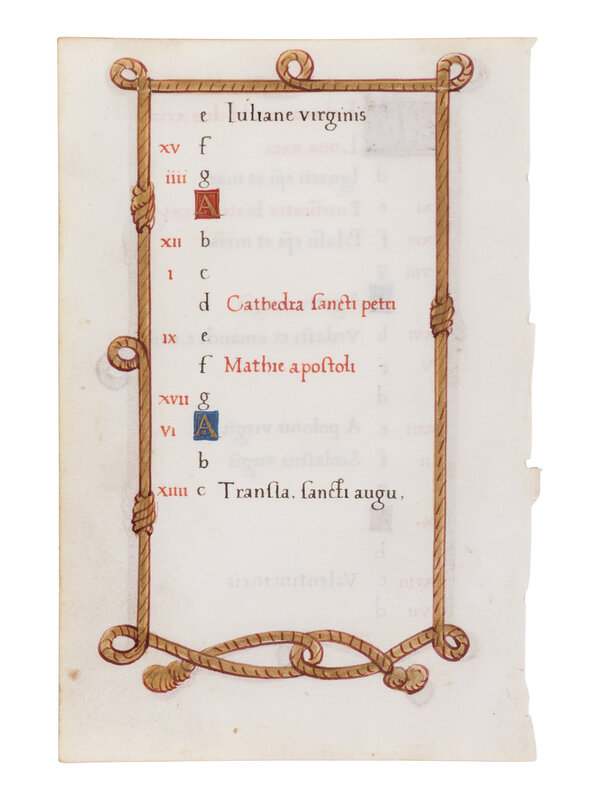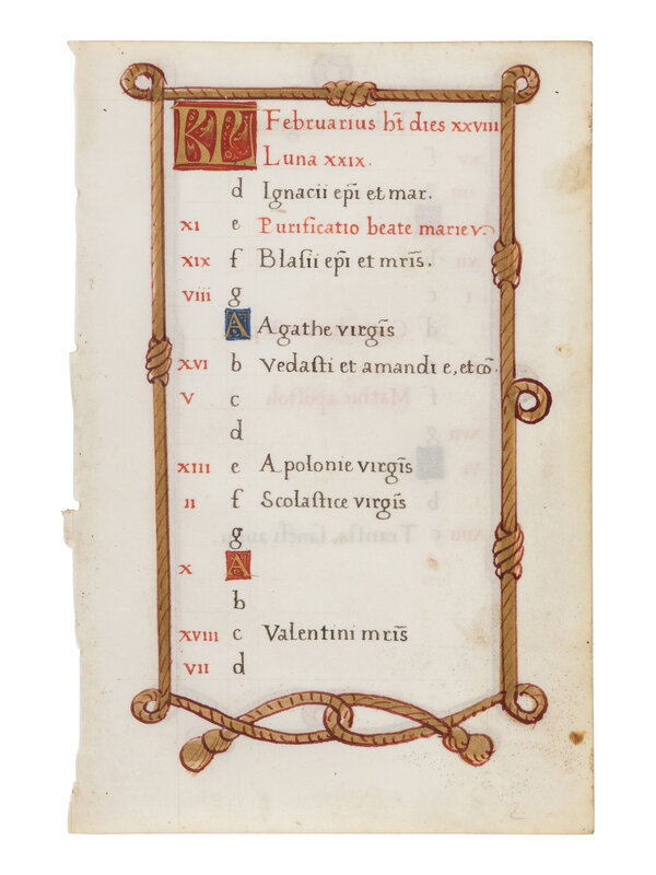 168 × 113 mm. Single leaf, ruled in drypoint for single column of seventeen lines (justification: 91 × 58 mm), written in a rounded humanist script, with calendar entries in red and brown ink, Saint Amandus and Saint Vedast (Feb. 6) indicate Chartres Use, single and two-line initials in liquid gold on alternating red and blue grounds, two-line initial with decorative gold penwork, framed within a striking trompe-l'œil border of knotted cord (Cordeliers borders), with terminal loops and painted shadows for dimensional effect. Slight thinning and tearing at inner margin from previous binding, else in good condition.