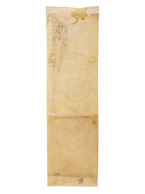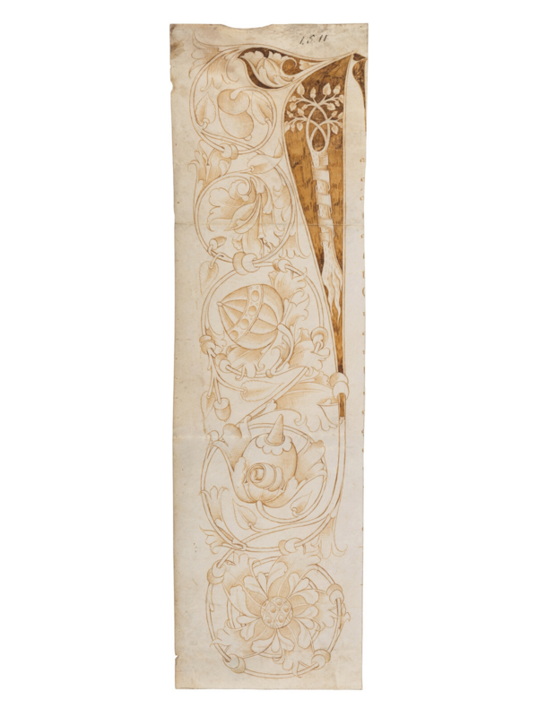 360 × 105 mm. Single cutting of the lefthand column of a charter or financial instrument of unknown dimensions, with letters visible on the right and sigil of the della Rovere family in a large initial ‘I’ formed of an oak tree with roots and a crown of leaves and acorns, all wrapped in a banderole, a profusion of foliage terminating in large blossoms, acorns, and other foliate designs, drawn in sepia ink, likely the same used to produce the charter, dated 1511 in an early modern black ink at the top. The document was originally folded with three light creases, remnants of glue remain on verso from an earlier mounting, as well as two hinges, slightly soiled, else in good condition.