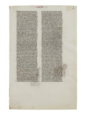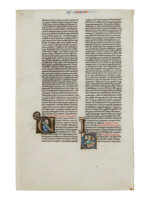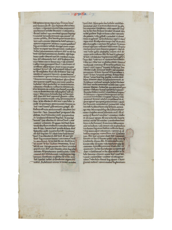 c. 220 × 135–150 mm (each), six leaves, ruled in plummet and written above top line in two columns of fifty lines, in a small, highly regular Gothic bookhand, TWO HISTORIATED INITIALS ‘U’ with Obadiah, half-length, scroll and initial ‘E’ with Jonah, young and beardless, hand raised (end of Amos, Obadiah and beginning of Jonah). Marginal wear and discoloration to margins, tape stains present to the verso of some leaves, gold and pigments lustrous and in excellent condition.