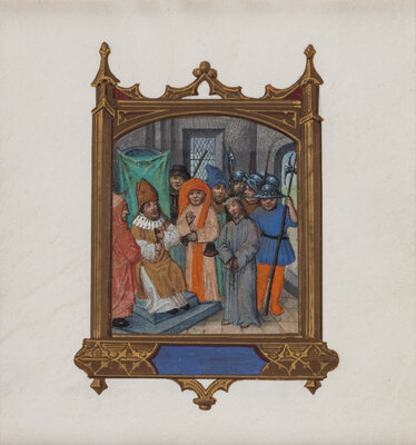 Single leaf, Christ before Caiaphas, tempera on vellum (c. 117 x 90 mm, sheet; c. 65 x 60 mm, outer edge of Gothic frame), Bruges, c. 1525, and London, c. 1850.