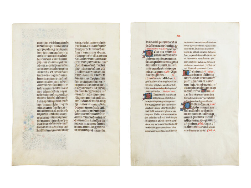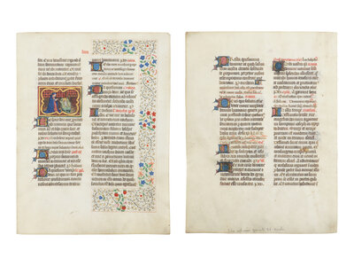 c. 346 × 265 mm. Two leaves, ruled faintly in brown ink for two columns of twenty-eight lines (justification 219 × 174 mm), written in a formal gothic bookhand in dark brown ink, rubrics in red, quaternions in red in top margin, two-line initials in burnished gold on red and blue grounds with white decorative penwork infill, ONE ILLUMINATED MINIATURE of five lines featuring the Nativity with the Virgin kneeling next to the Christ Child in a manger, half border outlined in red ink with scrolling acanthus leaves in blue and gold, floral sprays in red, blue, and green, and burnished gold bezants. The parchment is well-preserved, with vibrant colors and shimmering gold, margins show minor dust soiling.