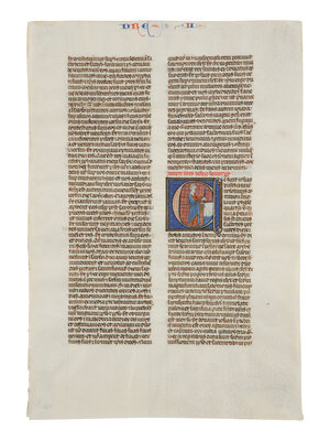 c. 230 × 160 mm. Single leaf, ruled in plummet, written below top line in two columns of fifty-one lines, in brown ink, the chapters exceptionally marked with 3-line illuminated initials, nineteenth- and twentieth-century pencil foliations present, ONE HISTORIATED INITIAL ‘E’ with Josiah asperging an altar (text includes the end of Nehemiah and beginning of I Esdras). Minor cockling, parchment clean and pigments vibrant.