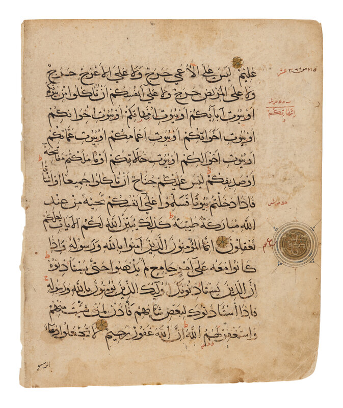 332 x 271 mm. Single leaf from a Qur’an, written in Arabic, on thirteen lines to the page in naskh script in black ink, with black and red diacritical markings, and gold, red and green floral verse markers, the large marginal ornaments marking the divisions of the text, rendered in gold and encircled in blue and white.