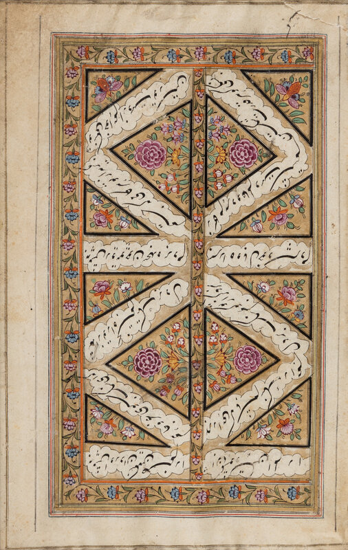 The manuscript was probably made in India in the in the eighteenth or nineteenth centuries when Persian poetic volumes of this type were popular. The pink, blue, orange and gold palette of the decoration, the use of richly ornamented floral borders, and polychrome and gold rules are typical of the Kashmiri style, which is closely related to the art of Persian illumination. Such illumination appears frequently in secular poetic manuscripts, while the distinctive rose forms on the main sheet of illumination also appear in Kashmiri lacquer painting as well as the art of Qajar Iran.