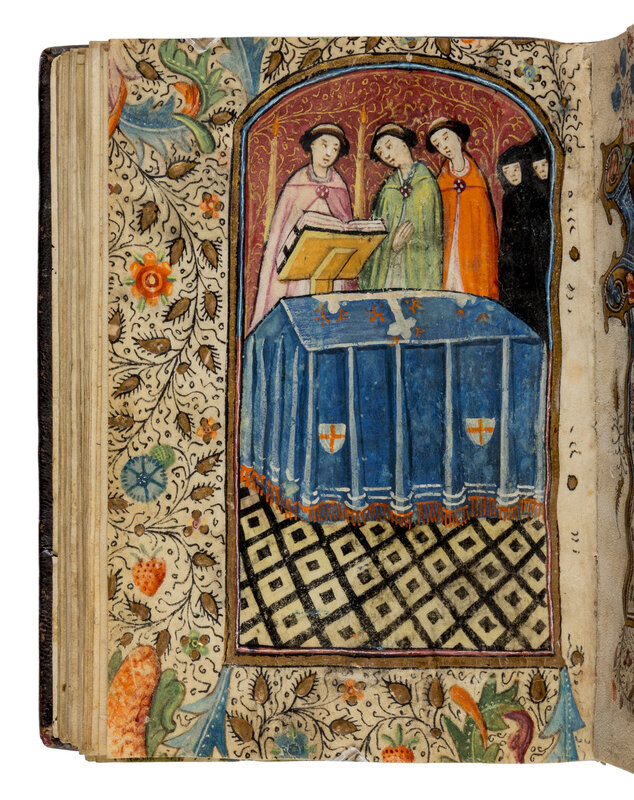 Stylistic details in this Book of Hours, such as the abruptly ascending landscapes, perfunctory cloud renderings, and tile patterning, suggest the manuscript’s origin in Bruges between 1420 and 1430, placing it among the Gold Scrolls group’s earlier works. These features, also seen in the Meermanno Hours (Use of Sarum) and other related Hours like Christie’s London, June 14, 2021, lot 16 (Use of Rouen) and Christie’s London, July 10, 2024, lot 26 (Use of Tournai), highlight the workshop’s role in the early export of this style to England and France.