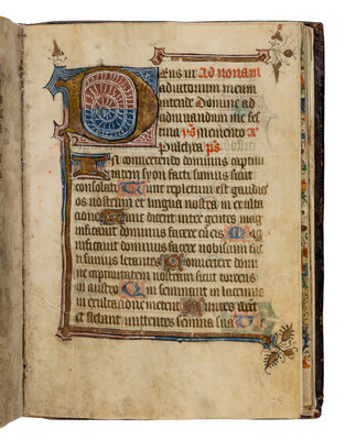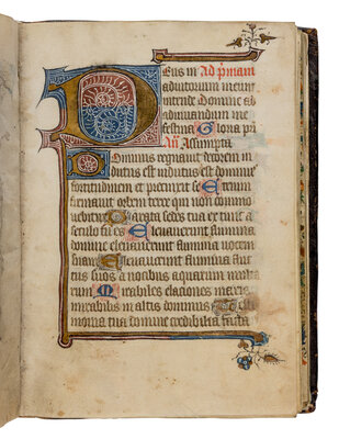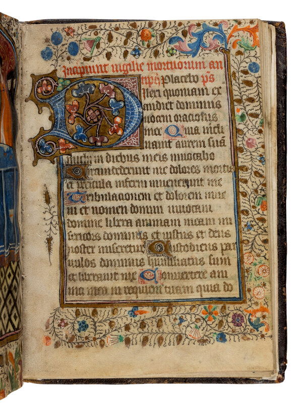 145 × 105 mm, i (paper) + 72 + ii (paper) leaves, foliated in modern pencil 1–72, ff. 10v, 19v, 27v, 30v, 40v, 54v, and 72v left blank [collation: i6, ii8, iii8-4 (missing four leaves between ff. 20v–21r and 24v–25r), iv8, v8, vi8, vii8, viii8, ix6, x6, plus four inserted leaves with miniature (ff. 7, 11, 43, 55), ruled in brown ink for eighteen lines of text in single column (justification: 67 × 124 mm), written in textura quadrata script, headings and major feasts in the calendar in red; verse initials alternately in blue with red penwork, or gold with blue penwork, two-line initials in gold on blue and red ground with white ornament, decorative program gives way to simpler pen-drawn initials in alternating red and blue ink between ff. 65r–72r, six-line initials of burnished gold on alternating red and blue ground beginning the minor hours, SEVEN FOLIATE INITIALS of six lines composed of burnished gold on alternating blue and red ground overlaid with white pen filigree beginning major hours, FOUR FOLIATE INITIALS of six lines painted in red and blue ink with white filigree on burnished gold ground with acanthus infill painted in blue, red, and green, these accompanied by full foliate borders of acanthus terminating in flowers and gold bezants, these facing FOUR FULL-PAGE MINIATURES in gold frames with full borders on inserted leaves, blank on the recto. Nineteenth-century panel binding over board, “SECU XIV” gilded on the spine. Cropping to border decorations, cockling, rubbing, and minor staining throughout, otherwise in good condition.