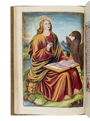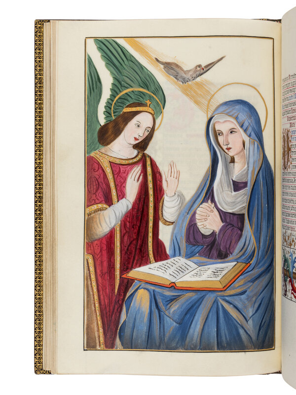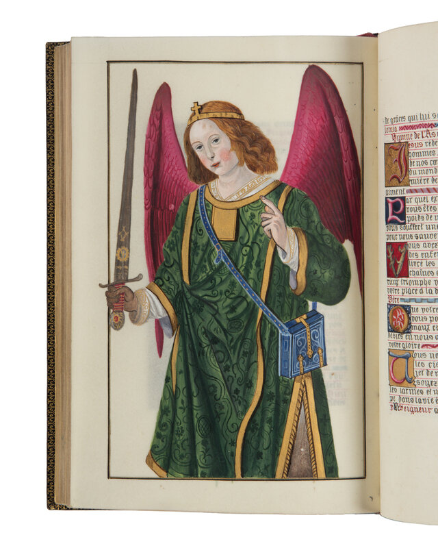 In the spirit of the Gothic Revival, Gruel had access to models that he used in his books, models that were largely popularized through several publications and model books such as Paul Lacroix (Les arts au Moyen Age, 1874) or Ferdinand Seré (Les arts somptuaires…, 1852). Amongst the models that circulated were the famous miniatures by Jean Bourdichon, including those illustrating a manuscript that was particularly admired, that of the Hours of Anne of Brittany (Paris, BnF, MS lat. 9474). The present compilation of prayers has several models, but one clearly recognizes certain large miniatures from the Hours of Anne of Brittany, such as John on the Island of Patmos; the Annunciation; the Archangel Raphaël and his characteristic sword and book satchel. Also influenced by the Hours of Anne of Brittany, are the bright illusionistic and naturalistic bracket borders found in the Rayel-Champion commemorative manuscript.