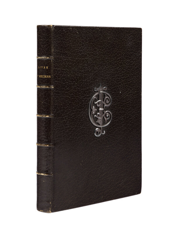 Dimensions: 220 x 145 mm. 66 leaves, 110 decorated borders and five full page illuminations. Bound in brown morocco, back sewn on 5 raised bands, gilt lettering on spine (LIVRE D’HEURES), name of binder (and book-dealer) at the foot of spine (GRUEL), brown silk pastedowns and lining of recto of first flyleaf and verso of last flyleaf, gilt tooling framing the inner boards, metal fixtures on upper cover, initials C and I (or I and C), perhaps for Julie Champion, recently wed ? Good general condition, a few stains on the lower cover, bands of spine a bit rubbed.
