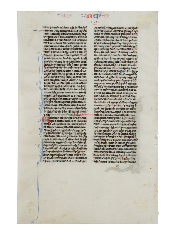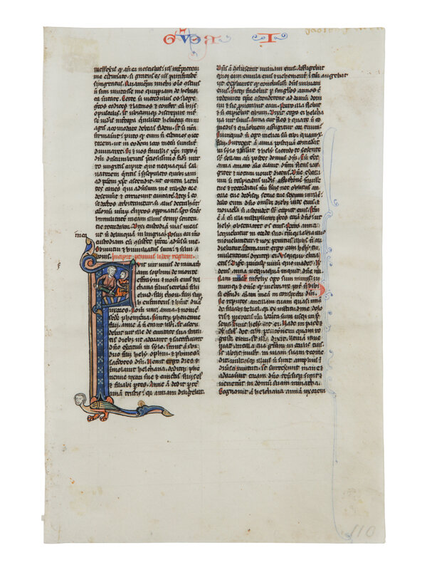 155 × 100 mm. Single leaf ruled in plummet for double column of forty-four lines and written below the top line, foliated in thirteenth-century pencil in the lower right corner of the rectos,upper outer corners inscribed in German with the names of biblical books (now cropped), gutter edge of each leaf displays four holes or cuts, possibly from medieval stab-stitching, rubrics in red, header alternating in blue and red ink, ONE HISTORIATED INITIAL ‘F’ of approximately twenty lines, painted in rich tones of blue and rose, with white penwork and burnished gold accents, the lower vertical shaft descending into the margin, ending in a curling terminal with an animal head and subtle marginal flourishes. The decoration is well preserved with only minor pigment loss, cropping at the bottom has affected the flourishing, else in good condition.