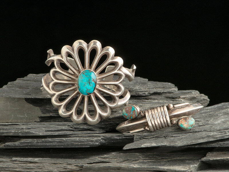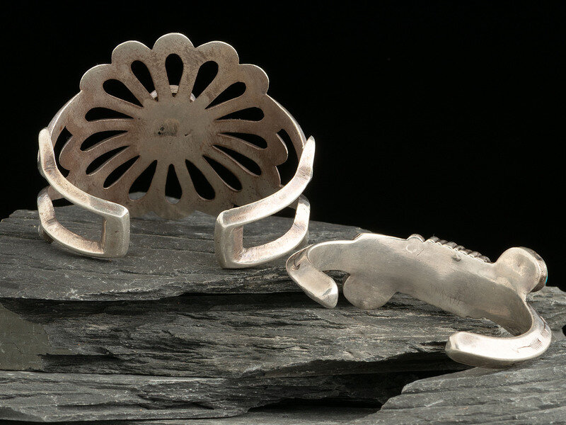 an example with a stamped carinated band and set with two offset turquoise stones; etched with a trader/pawn code AMA4+