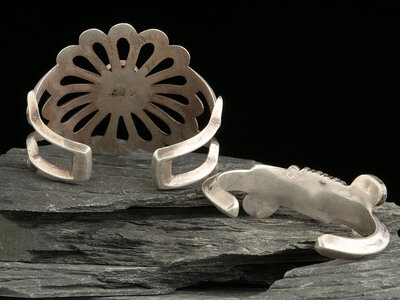 cuff width 1 inch (at widest point), interior circumference 5-1/4 inches + gap length 1-3/16 inches, weight 35.4 dwt.