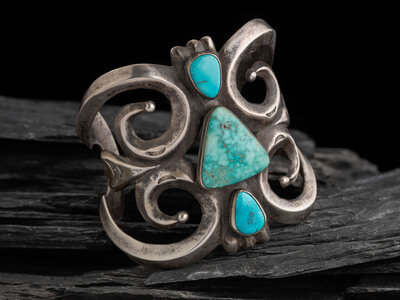 Large Navajo Sandcast Silver and Turquoise Cuff Bracelet
