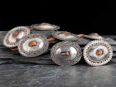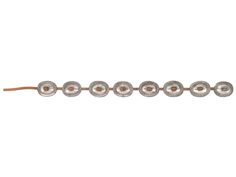 featuring an earlier stamped ingot belt buckle (ca 1900) and seven later (ca 1930s-1940s) oval-shaped conchas with stamped scalloped edges; not marked